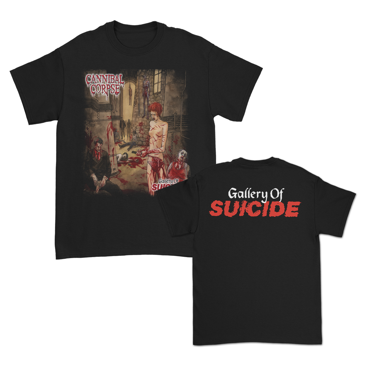 The Cannibal Corpse Gallery of Suicide design, printed on a comfortable, standard-fitting black t-shirt.