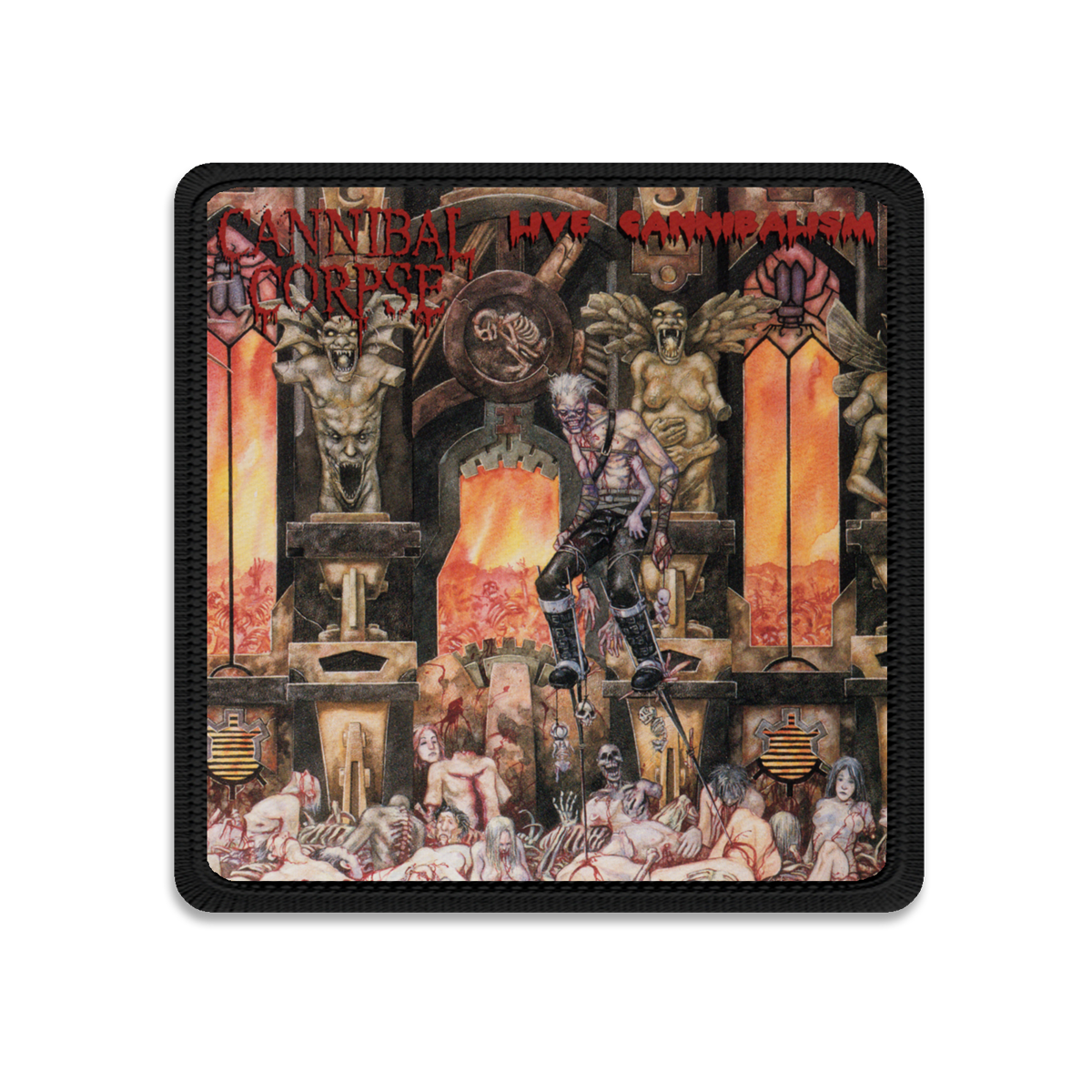 The Cannibal Corpse Live Cannibalism design, featured on a 4" x 4" in. patch with merrowed edges.