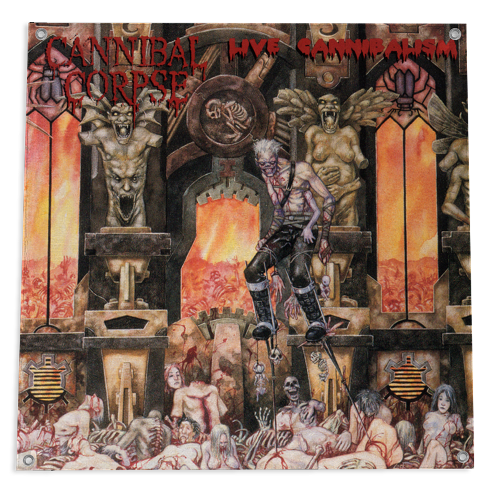 The Cannibal Corpse Live Cannibalism design, featured on a 48' x 48' ft. wall flag with corner grommets.